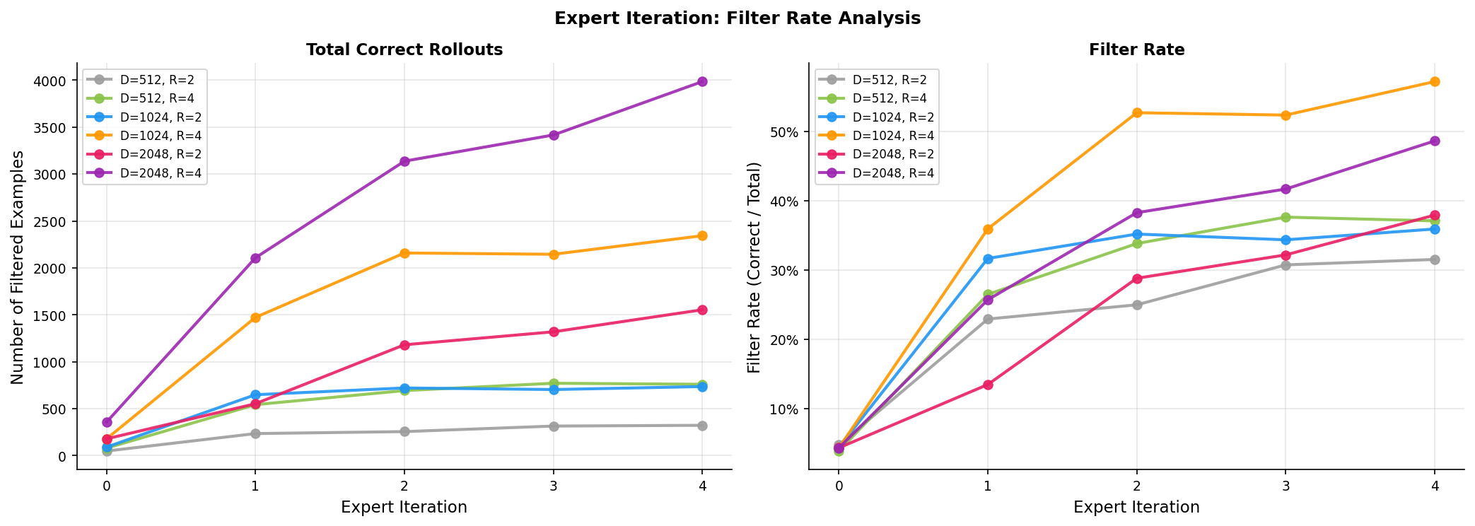 The filter rate correlates with final accuracy better than absolute example count. \(D=2048, R=4\) produces the most correct examples (~4000) but \(D=1024, R=4\) achieves the highest filter rate (~57%) and best accuracy. Basically, more data is not always better. You need better training examples than more examples.