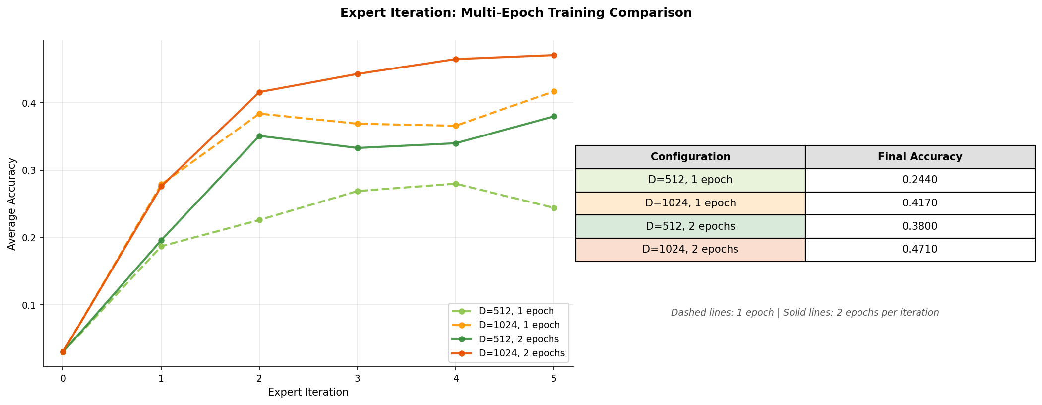 | Expert Iteration (best) | D=1024, R=4, 2 epochs | 47.1% |