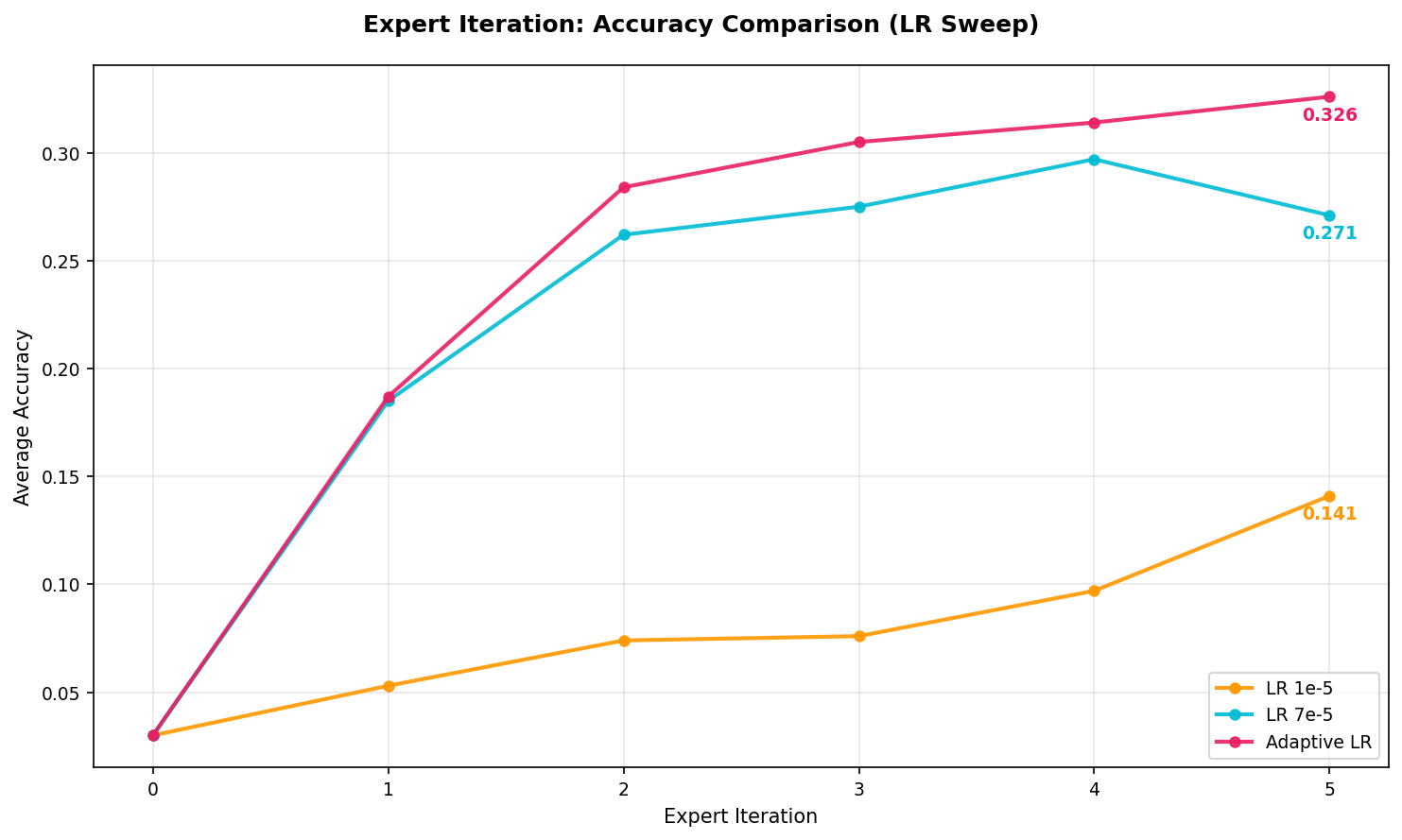 Despite extensive tuning across batch sizes, rollout counts and learning rate schedules Expert Iteration reached 47.1% accuracy which is around 6% below SFT’s 53.4%.