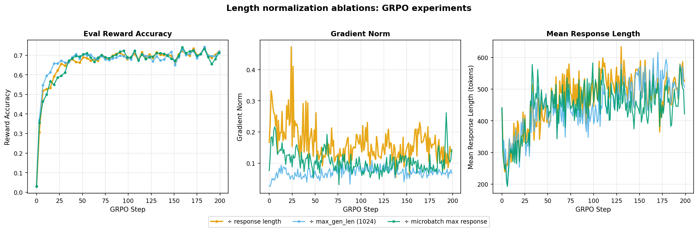 - However, gradient norm and mean_response_length are the two other important metrics to watch. They are the early warning signals for instability and reward collapse.