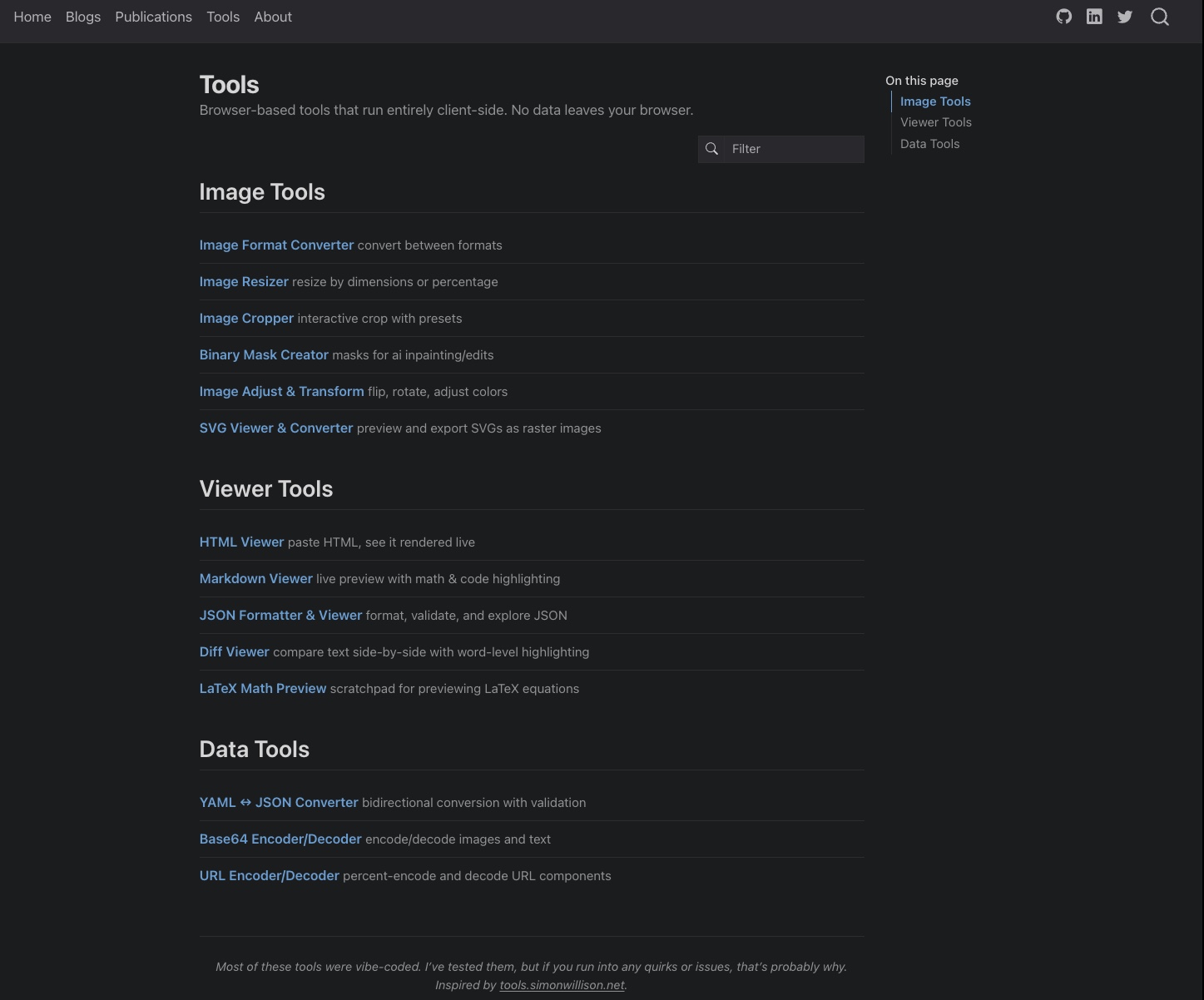 I always wanted something of my own, specific tools that I use often and would be handy to have on my website. Though I never got around to actually writing them. I am an AI/ML engineer and HTML and JavaScript are not my strongest suits. A few days ago I decided to just start building them using Claude Code and see how far I could get. Below are some of the tools I have built for myself and you might find them useful too.