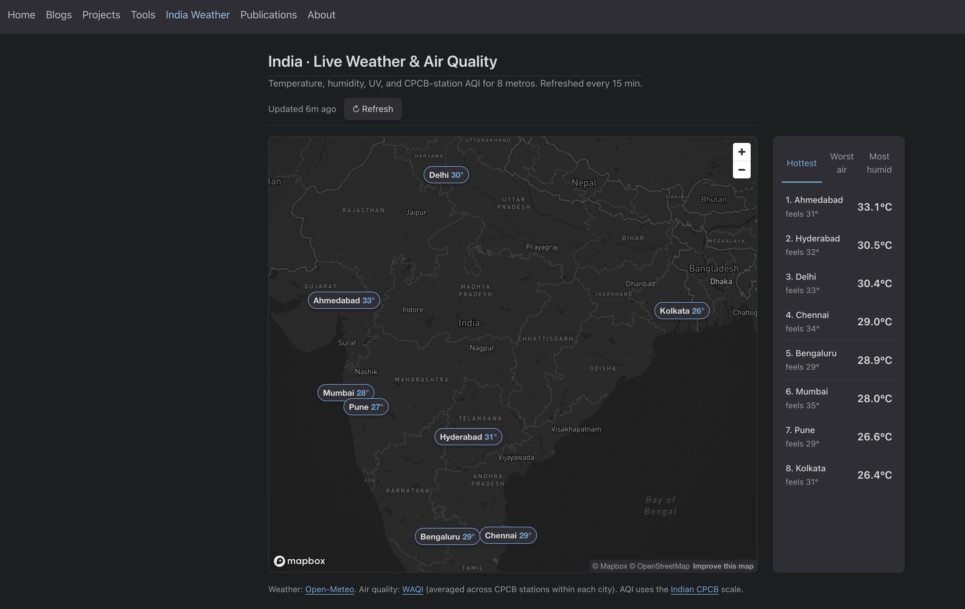 As a fun project, I built a small dashboard that shows the weather and AQI for the major Indian cities along with the option of viewing the history over 24 hours, 7 days and 30 days. Moreover, this dashboard fetches the data every 15 minutes so more or less you have a live view of the weather and AQI for the major Indian cities.