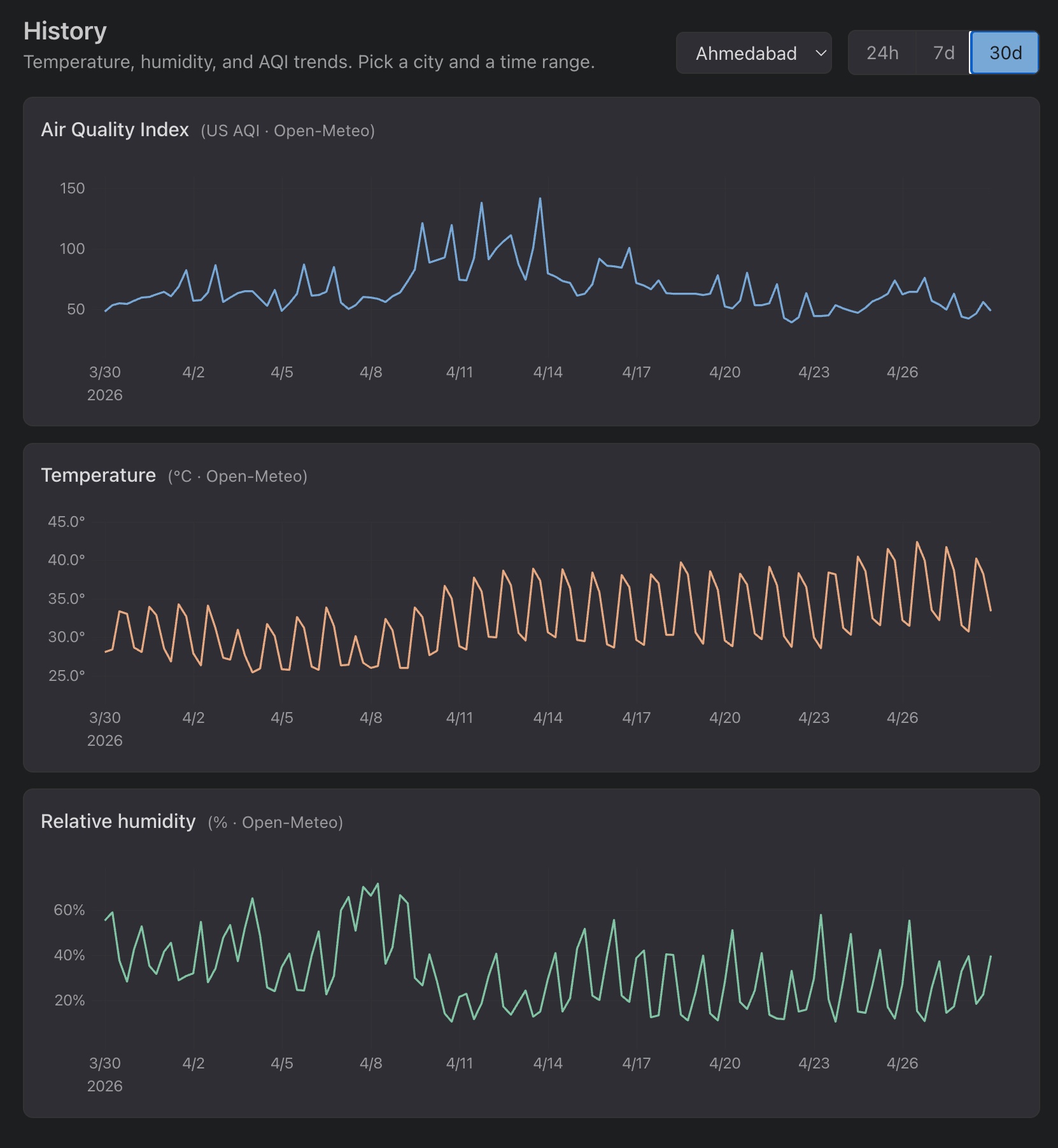 Claude pointed me at the weather.com pattern where weather apps aggregate the values by day, show a min/max bands with a daily mean line for temp and humidity, and color the AQI bars by EPA category. A second daily cron rebuilds the 30-day window from Open-Meteo each run which looked much nicer: