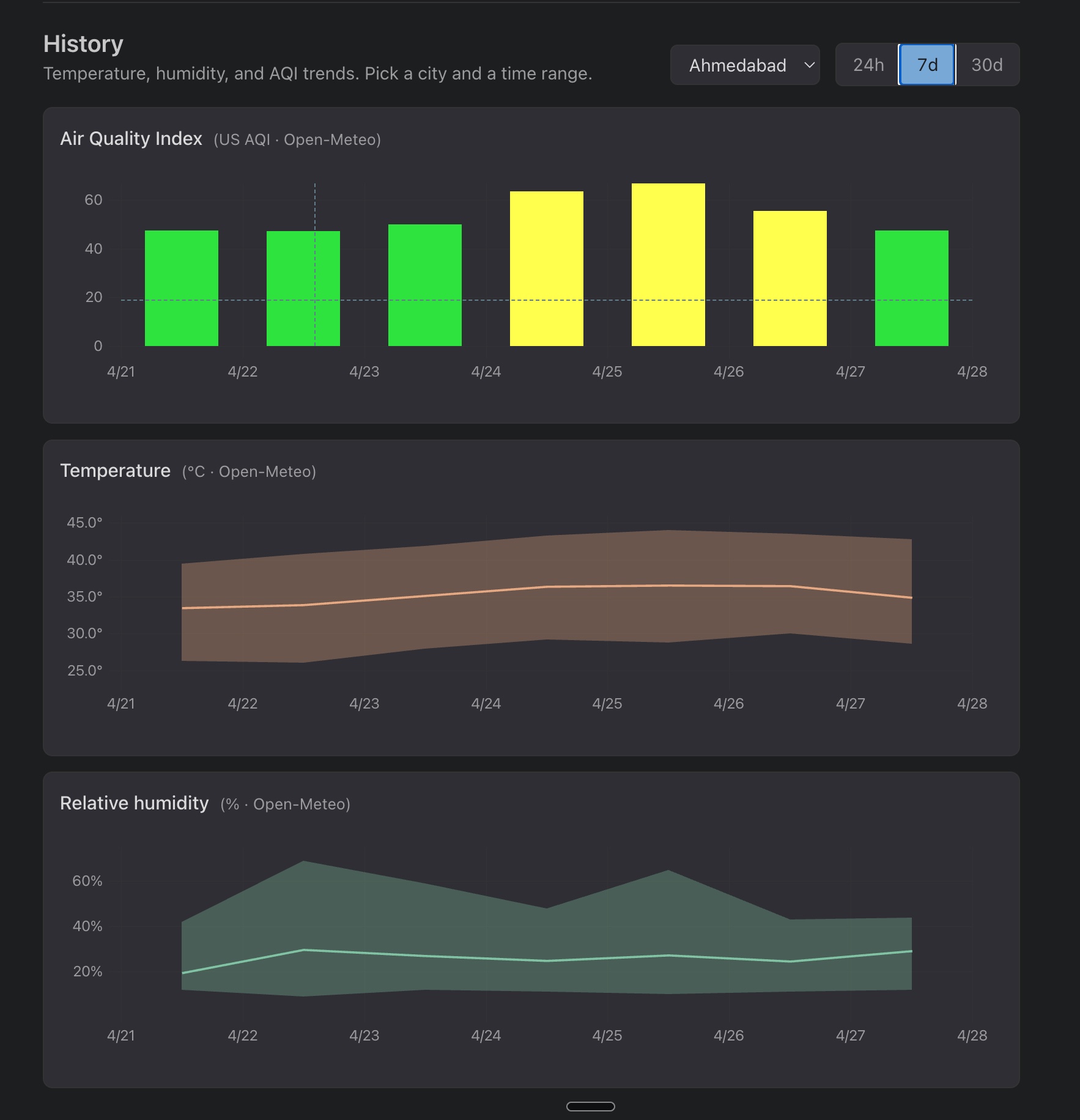 The next thing that I wanted to do was to add history charts under the map. I wanted to be able to view the history of the temperature, humidity and AQI for each city over certain time periods. This is the first version that I made conversationally with Claude: